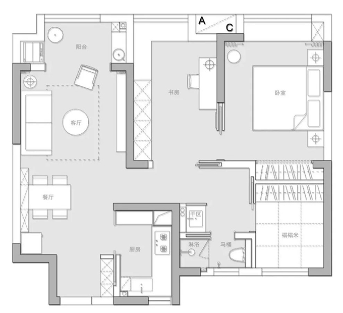 圖2.戶型改造:1、我們將利用鞋柜的柜體和削薄墻體,利用第一扇內(nèi)嵌門,能保證過(guò)道的寬度,鞋柜的正常深度和廚房的空間利用最大化;2、我們利用第二扇內(nèi)嵌門,將衛(wèi)生間改造成干濕分離,原本以為淋浴空間比較小,現(xiàn)場(chǎng)的實(shí)際感受也比較舒適;3、我們利用第三扇內(nèi)嵌門,將北面的小房間打造成榻榻米房,業(yè)主說(shuō)冬天的時(shí)候坐在榻榻米上泡腳就近衛(wèi)生間應(yīng)該是一件很享受的事情;4、我們利用第四扇內(nèi)嵌門,打造了小兩口的書房和臥室的套間;5、我們利用第五扇內(nèi)嵌門,打造了臥室和書房可開可合的空間。